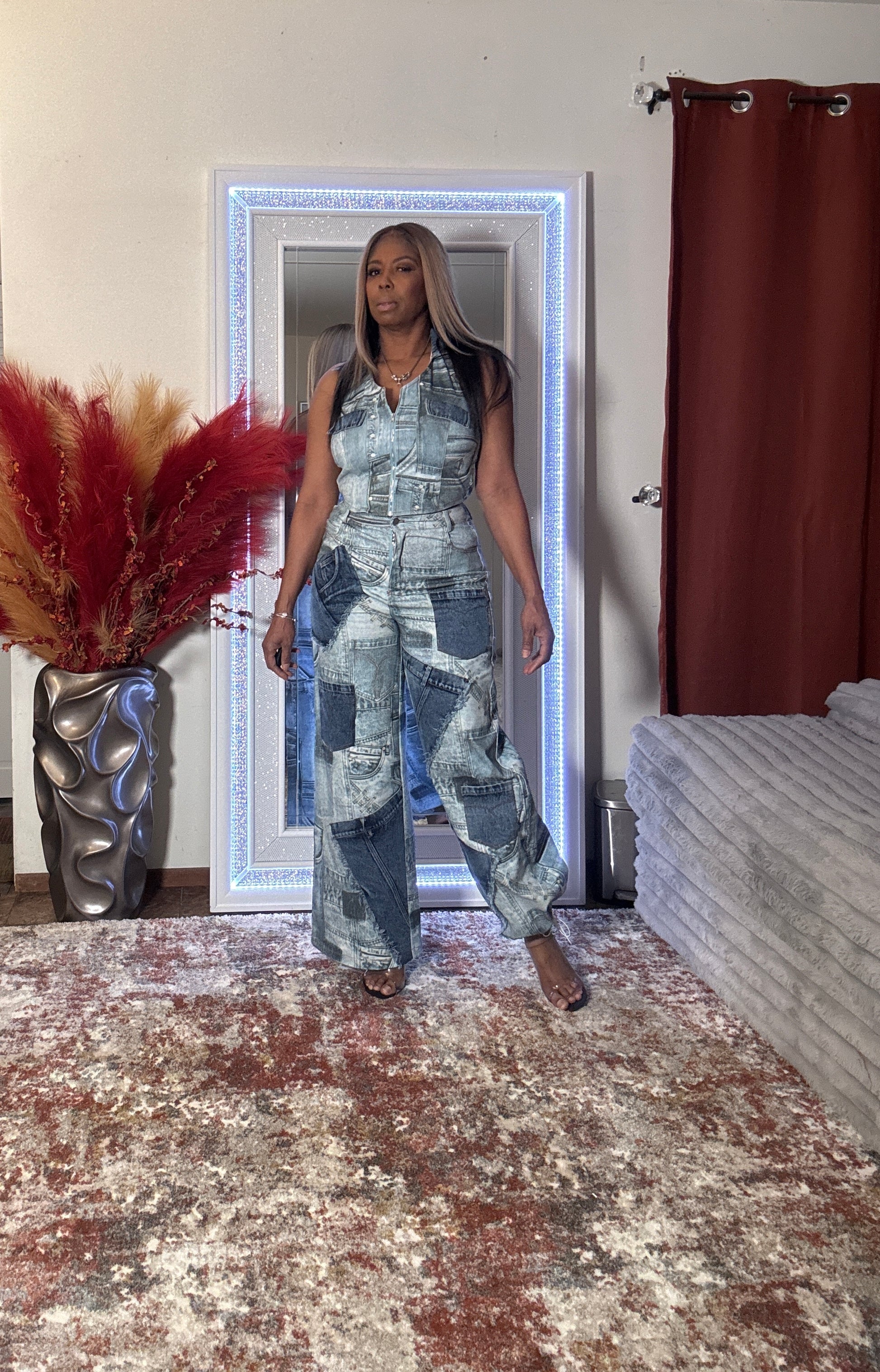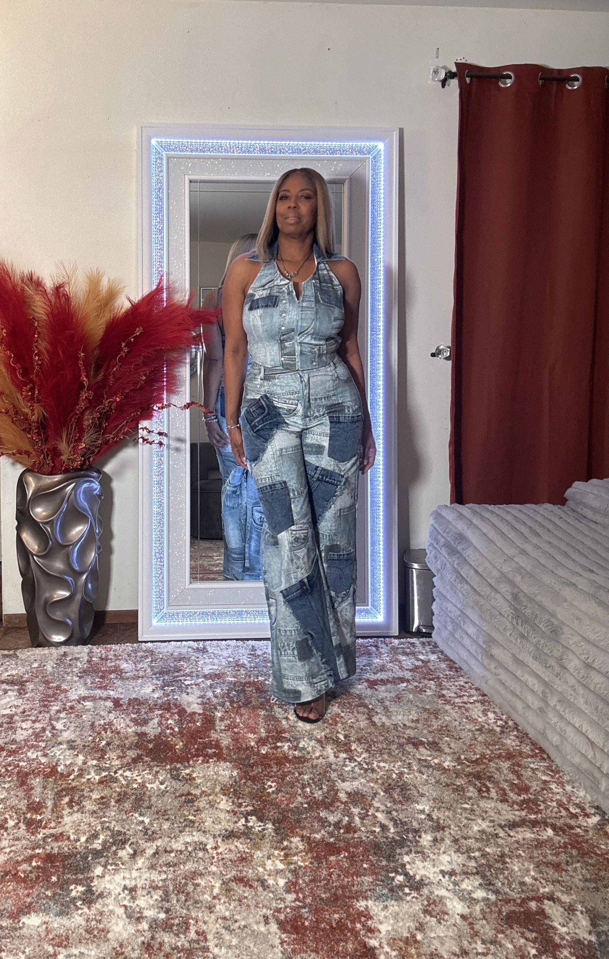 Two piece halter top with a zipper and elastic waist pants and drawstrings and the ankles