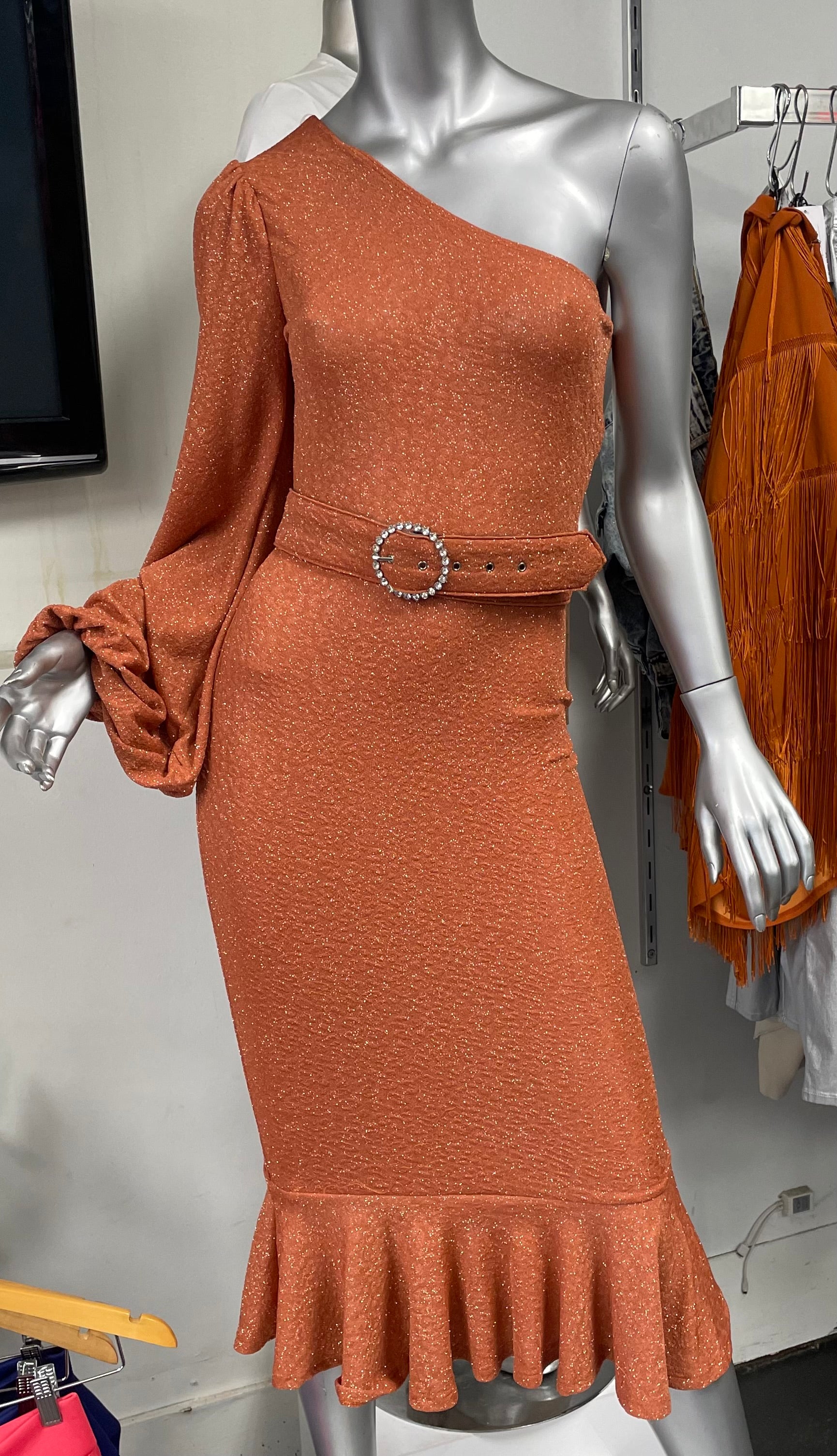 One arm (right arm)dress with a belt and ruffle bottom this material has a shimmering look