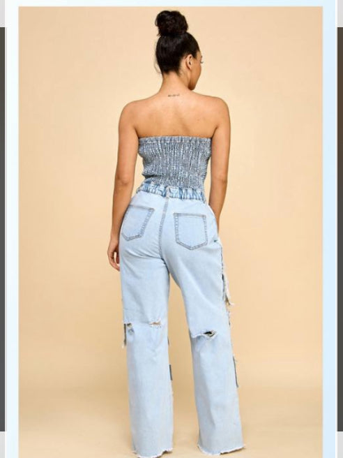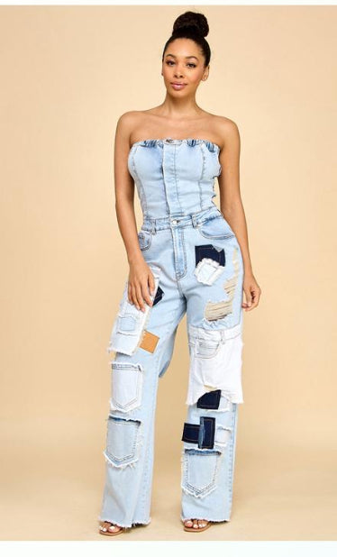 Strapless spandex back jumper with patches and multiple pockets with a front zipper and buttons