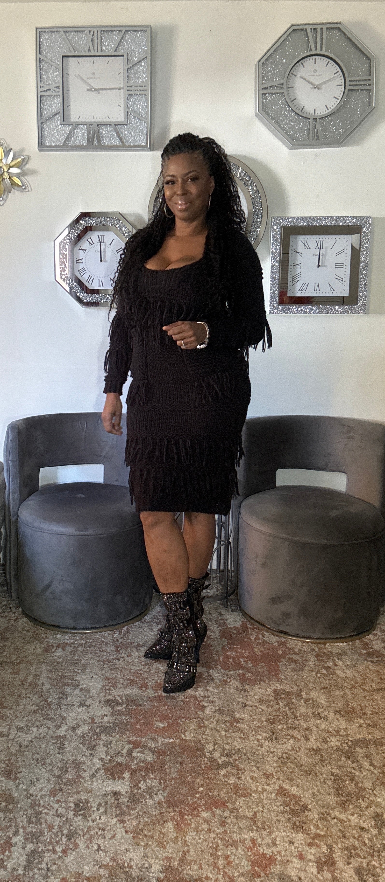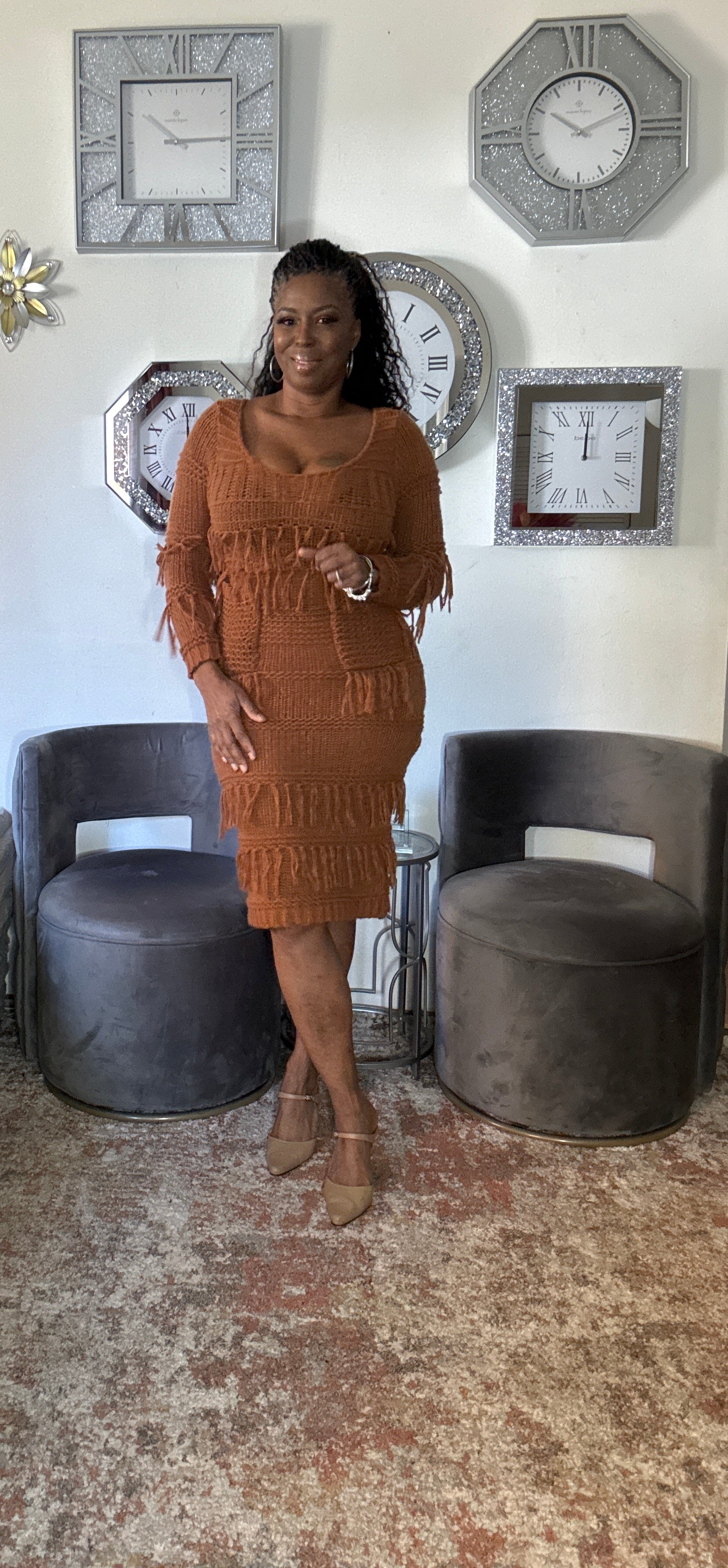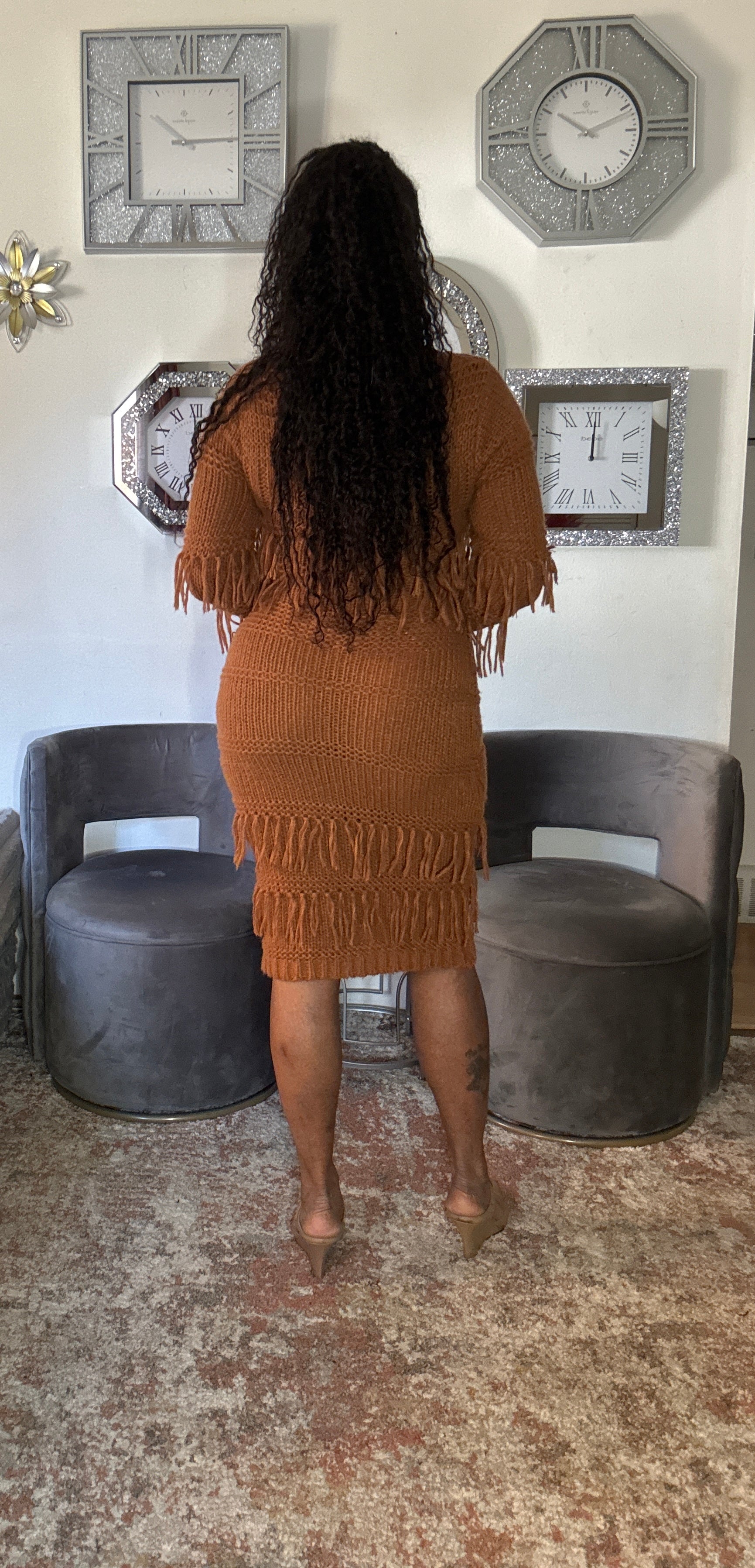 Sweater dress with round neck accented with pockets and tassels