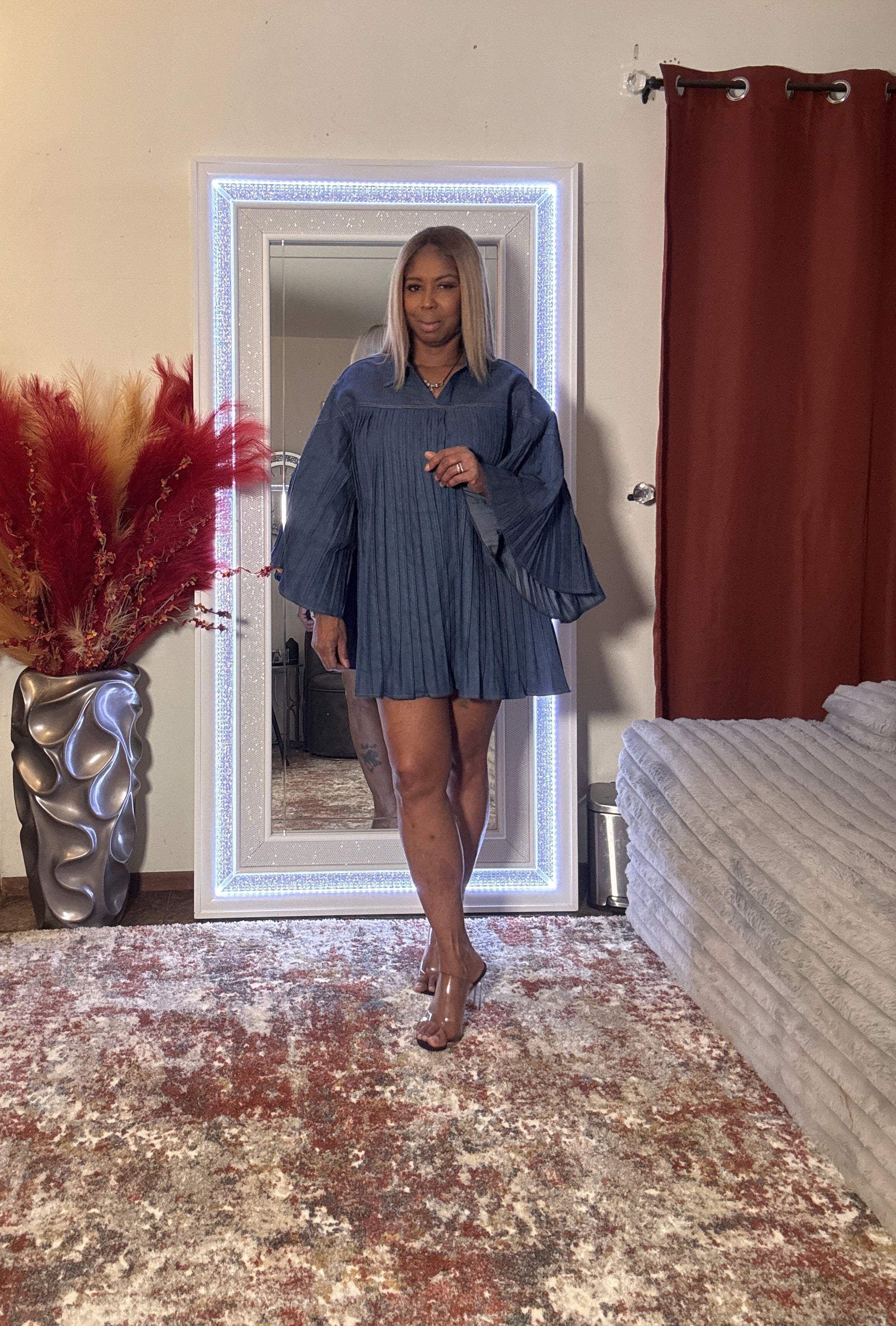 Pleated top and or dress with 3/4 wide bell sleeves. If you would like to wear as a dress order in a larger size to give the length and smaller if you want to wear as a top. Model is wearing a XLarge for the dress look